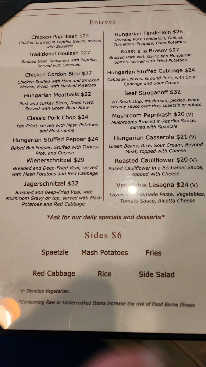 The salads, such as the refreshing Greek Salad and marinated Tomato Salad, set the stage for a satisfying meal. Warm up with hearty soups like Goulash and Chicken & Tarragon, perfect for comfort-seeking diners.
